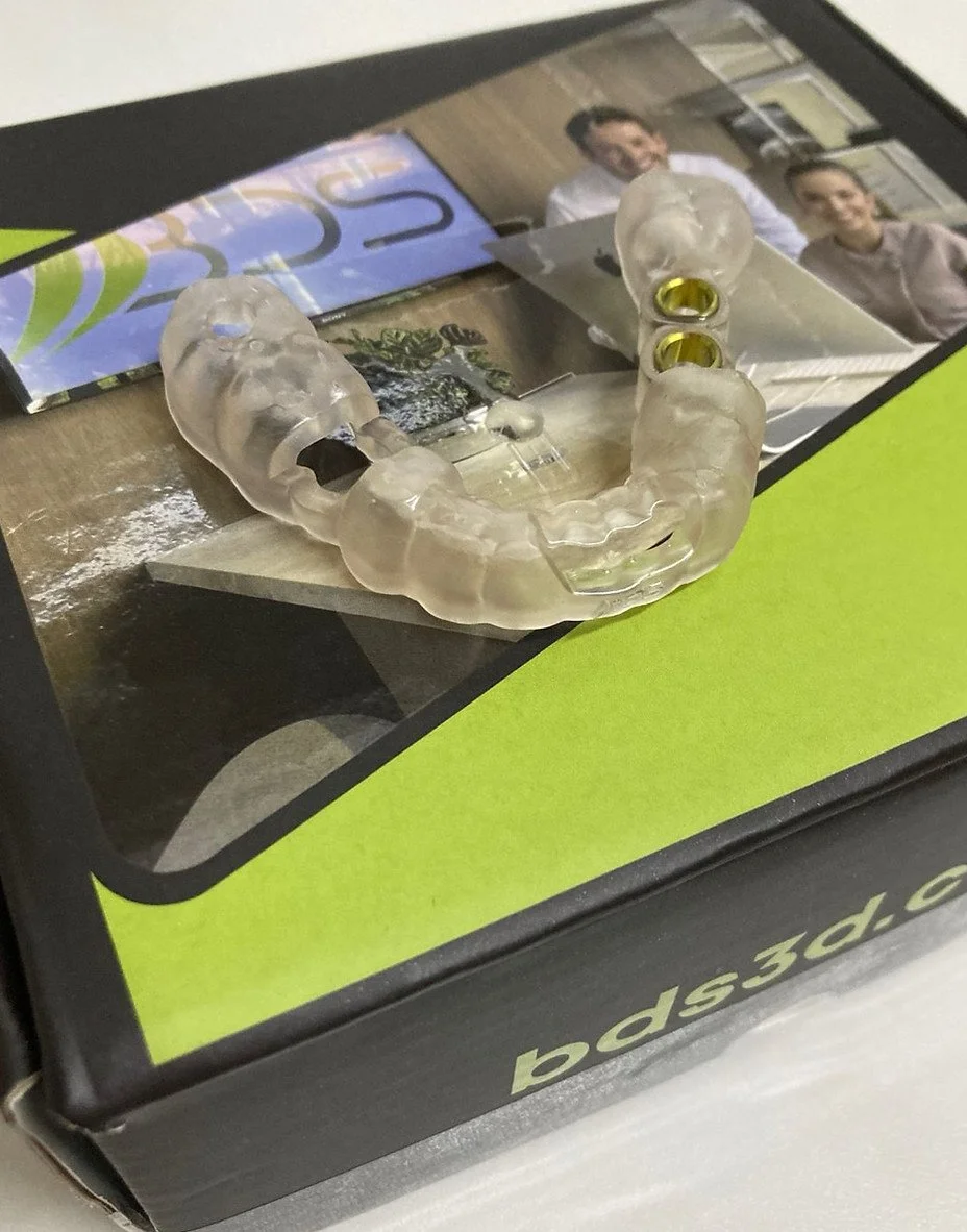 Um guia cirúrgico para implante odontológico é uma ferramenta personalizada que auxilia o cirurgião dentista durante a colocação de implantes dentários. Ele é projetado a partir dos exames de tomografia computadorizada e escaneamento intraoral do paciente, e fornece orientações precisas sobre a posição, ângulo e profundidade ideais para a inserção dos implantes. Isso garante uma cirurgia mais precisa, reduzindo o risco de complicações e otimizando os resultados estéticos e funcionais para o paciente.